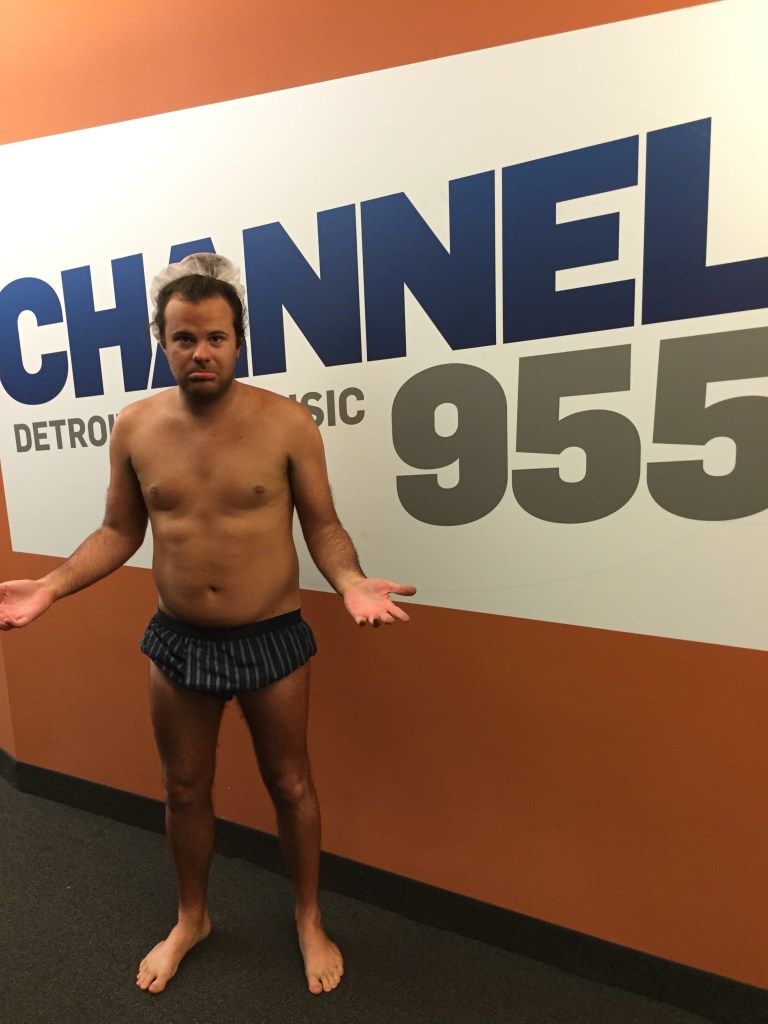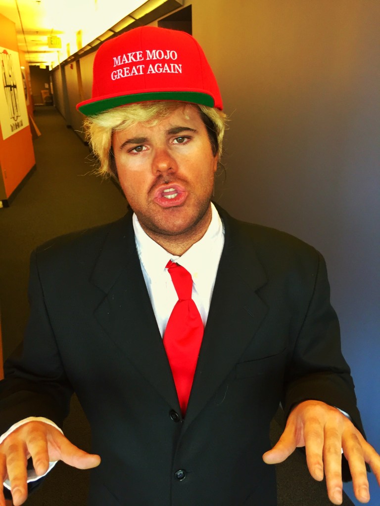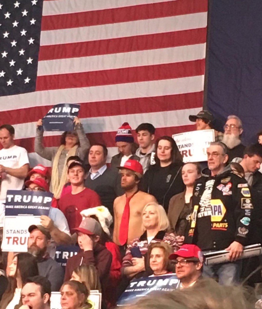 While the crowd waited for Candidate Trump to come out music played over the loud speaker but it was tough to hear because the entire crowd was chanting “Built The Wall! Build The Wall! Build The Wall!” I felt like I was at church. That eery feeling when everyone is chanting in the same tone, lifeless, and robotic. They were all-in. We waited and waited as the chants continued. Maybe a lock her up thrown in there here and there as a curve ball. Candidate Trump was at least 30 minutes late. Then it happened. He walked out and the crowd erupted and out of the speakers they loudly played…Uptown Girl? That’s one of the main things I recall about that rally. Trump walked out to Uptown Girl. Surely, that couldn’t have been planned and was a result of him running late, but it stands out to me. Those around me didn’t find it as amusing when I pointed it out. It wasn’t long before he had his first person booted from the rally. Then another. A third shortly after. Is this my fate? Is there something I could yell? Is that what Mojo and crew are expecting me to do? No. I couldn’t get kicked out. I have perfect location directly behind Trump. Anybody looking at him sees me. Dressed as him. So, I started doing all the wild hand gestures he was doing. Mimicking him. I got some looks but the people never seemed to mind. This grew old after a little bit, so I took it further. I slowly started removing my suit. Layer by layer until I was standing behind him wearing nothing but my underwear, a blonde wig, and a red Make Mojo Great Again Hat. The entire crowd watching him, now saw me. It got noticed online and on the TV as it was being broadcast. I also noticed I now had the attention of two Secret Service agents at the end of our row. They were locked onto me. It became clear that they were waiting for me to streak. Ah streak! That’s what I could do! But, I didn’t want to get roughed up. So I stayed behind just stretching and mimicking him, nearly naked.