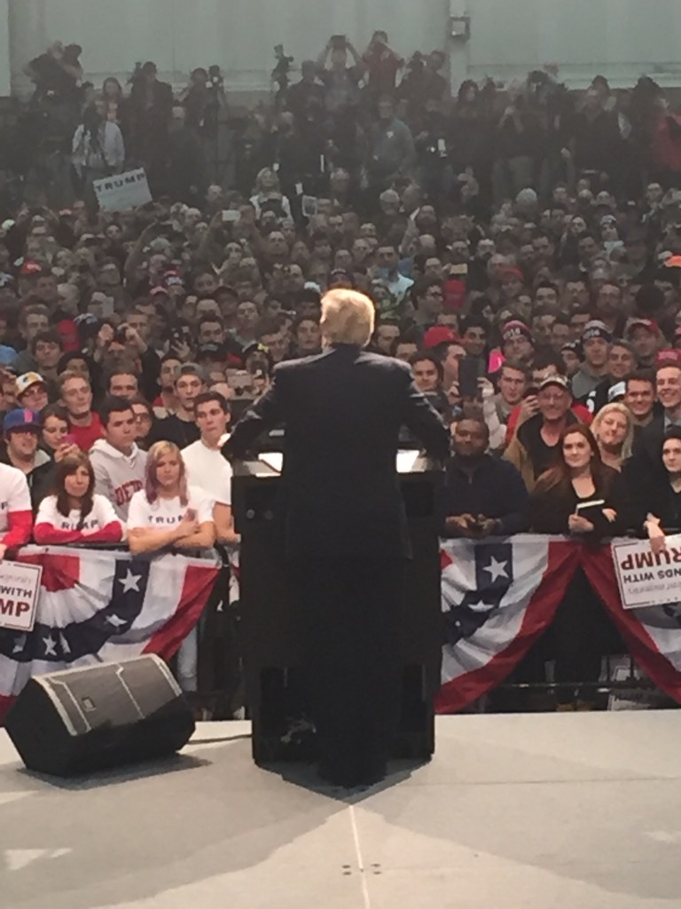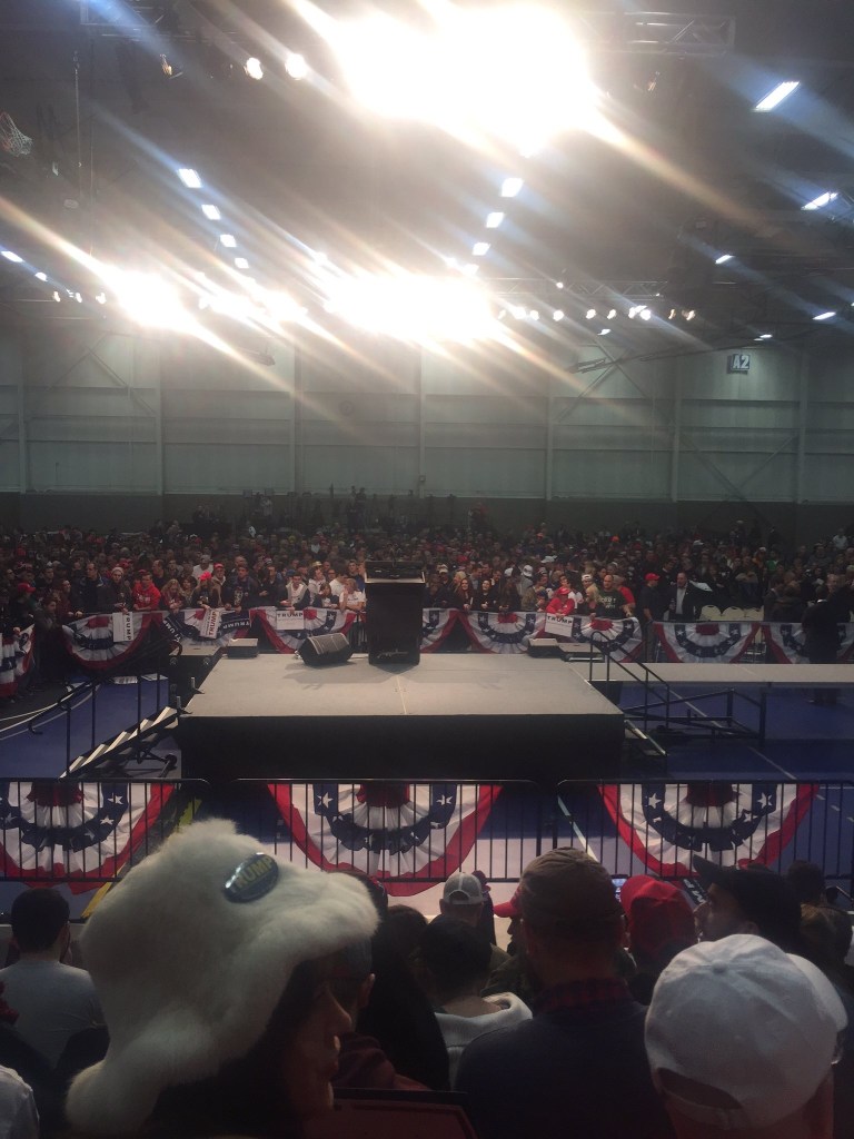 The crowd was more diverse than I had imagined. Mostly white, blue collar folk. But more diversity than I expected. A bulk of the crowd seemed to be made up of Young Republicans. High school aged kids with their red hats on and varsity jackets. I mingled with the crowd while we waited for the speeches and rally to start. I knew better than to introduce myself as media or from a radio show as that would clearly identify me as an enemy of the people. I chatted with people pretending to be a die hard fan, myself, so I could record some audio and get their thoughts on things. As a bit, I made up proposals that Candidate Trump wanted to accomplish if elected. Bogus, crazy proposals that nobody could believe. But they did. Listen on the SoundCloud link below.